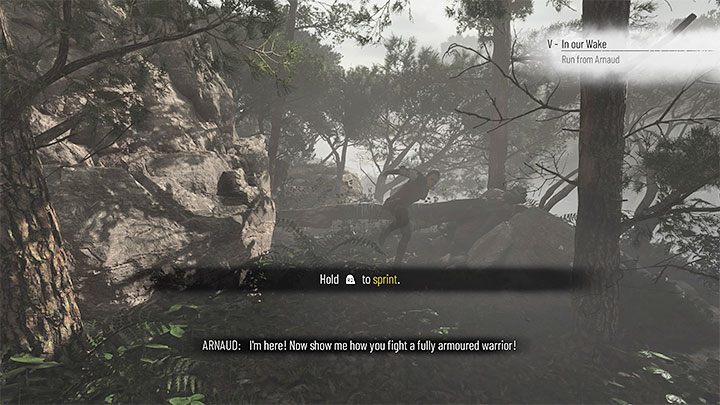 You'll briefly lose Arnaud, but he'll soon reappear again. Go down the path on the left and start running away again. Eventually Amicia will slide down, losing Arnaud for good.
