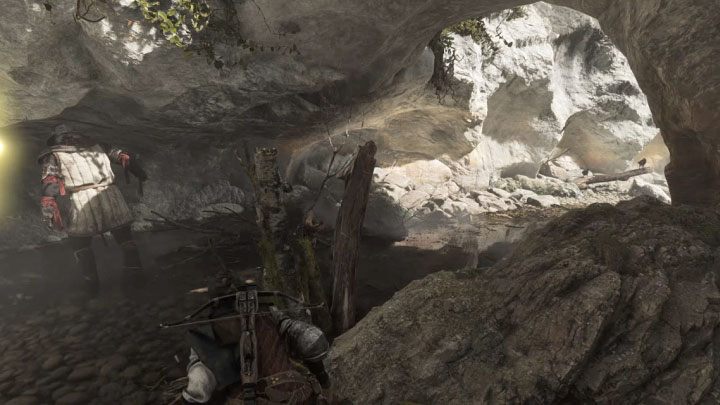 Despite what the objective says, you can take your time. Start traversing the cave. When you reach the fork in the road go down the right path and start sneaking past the bandits who've appeared nearby.