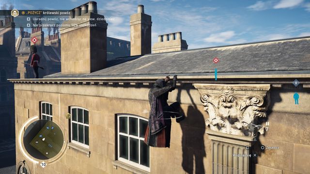 Head towards the courtyard while staying on the roof. On the left, you will see two enemies on balconies. You can go past them by hiding behind the chimneys. If you don't want to bother completing the optional objective, you can jump down, simply take the carriage and leave the area. However, it is much better to throw a smoke bomb under one of the carriages. The horse will run around the courtyard for a while, but eventually it will leave this area.