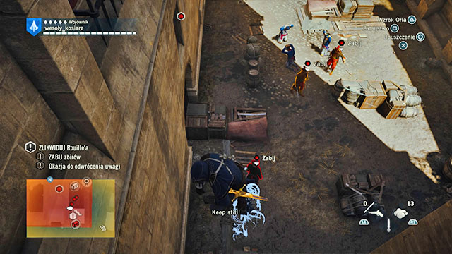 Your target is in the center of the tower. He's protected by a few snipers and a small group of ground enemies. You can defeat them in direct combat. Just use smoke bombs and a pistol. Choose your favorite way to kill them and defeat the guards, then Rouille. Remember to finish him with the dagger! After the assassination, escape the area. You're on a roof, so any direction will work.