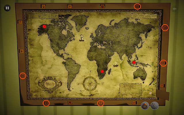 Now come closer to the map. Click on its right corner and move the dark golden plate. Put the signet into the hole. Now you need to set symbols of animals located in such points of the map borders that if you draw lines they would connect in the place where a specific species exists.