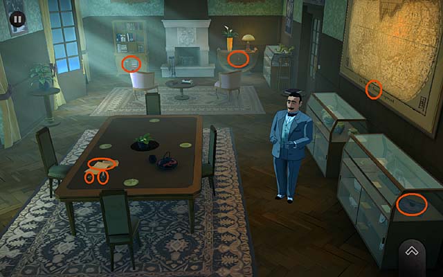 Leave the study and go the lounge. Look at the reproduction of Chinese map which is hanging above the showcases (one clue) and click it (on the bottom) to hear Poirot's commentary. Then look at the showcase on the right (one clue) and notice compass of Han dynasty - turn it to see its frontal.