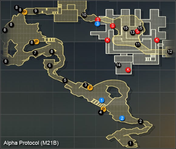 Open the door leading to the western room (M21A, 16). Look out, as the passage behind you will crumble and you will find yourself in an area occupied by the enemy. I'd suggest beginning with destroying the turret opposite to you. Only once it's destroyed should you move to attacking the guards. Be ready to leave your hiding place if the enemies decide to use grenades. Afterwards take the Intel on VCI (M21A, 6) and head towards the stairs leading to the upper floor (M21A, 17). If the alarm is on, you will probably bump into some more enemies on your way. In the other case, it's worth to avoid the cameras. You will meet your handler on the upper floor (M21A, 18).
