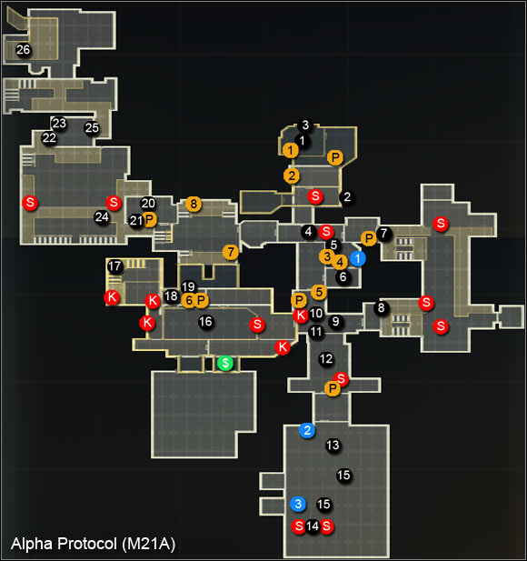After getting out of the elevator, get ready to eliminate the enemies patrolling the nearby corridor and those in the northern corridor, where you should now head. After getting inside, focus firstly on the (M21A, 1), thanks to which you will gain new Intel on Parker, the safe with Intel on Alpha Protocol (M21A, 2) and EMP grenades lying on the table.