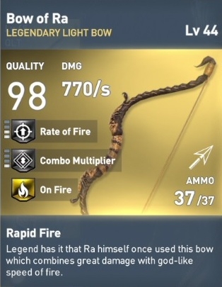 A light bow awarded for finishing The Greater Good main quest. Sets enemies on fire and deals additional combo damage.