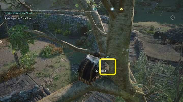 Once you have cleared the trade post, read the note attached to the tree in the location marked in the image above. You will learn where to look for the document you'll need to rebuild this trade post.