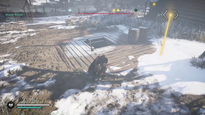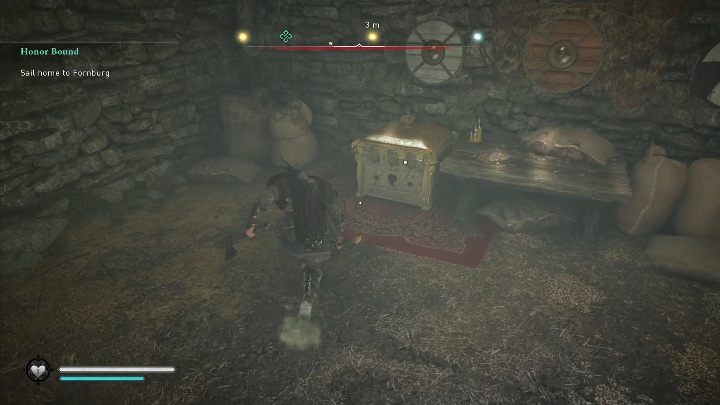 To get to the gear chest you have to jump into the hole between the wooden planks. It is easy to get to it if you use Odin's Sight. Then the golden box will light up and show you the way. You can jump down into the basement or use the ladder in a civilized way.