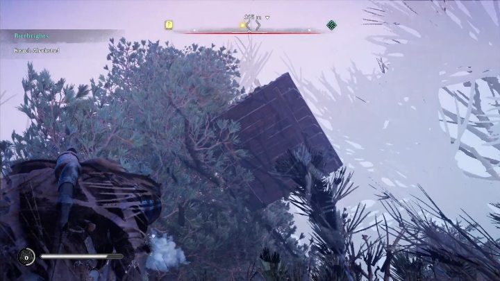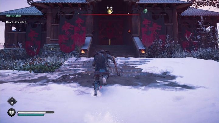 To get to the gear chest you have inside the wooden building with black and white banners hanging on it. Upon entering you will see your opponent defending his treasure. You have to defeat him, otherwise you will not get to the weapon. It is possible that during the fight a few more enemies will enter the building. Kill them all to secure your way to the chest.