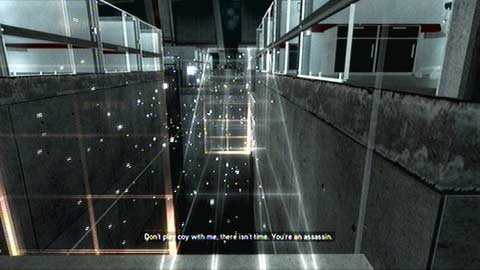 You'll reach a gap with orange grids. A grid will appear first on the right and then on the left and so on. Bypass them and get to the other side.