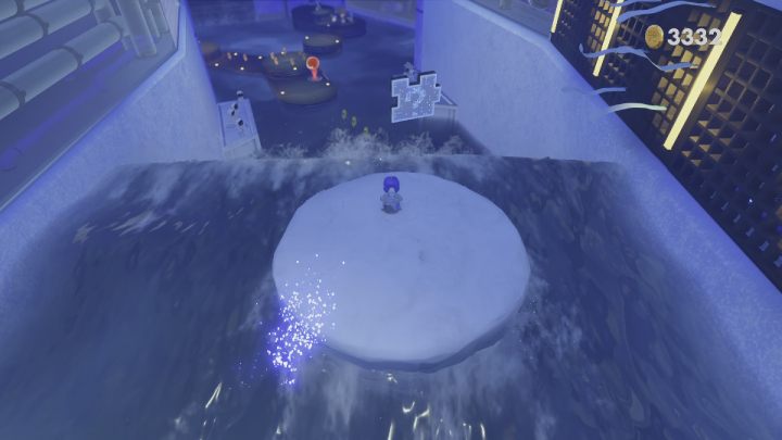Jump on the round ice platform and turn on the fan. As you move forward, defeat the enemies that will appear and jump to the next ice block. Along the way, just before you reach the waterfall, jump up and take the 4th puzzle piece.