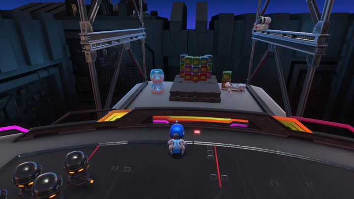Defeat all opponents and pull the cables. A controller with a slingshot will fall out of it. Jump onto the slingshot and use the touchpad to shoot yourself into the air. Steer the hand-glider to the left. Watch out for obstacles and land next to the robot standing by the balloons. Next to it, there are cables, under which the 1st artefact - the Buzz controller is hidden.