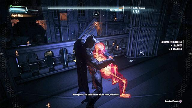 Two-Face, together with a new group of bandits, will show up after you've stopped the bank robbery. Ignore the main enemy at first and focus on his subordinates. Don't try to use the detective mode here, as your enemies have devices that can block it and that can detect the attempt to use it. Firstly get rid of the medics and then neutralize the enemies as you wish. Try to attack from the hiding place by using silent takedowns and use the observation points and ventilation shafts.