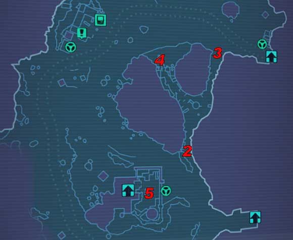 Zed [1] will ask you to find the source of the strange wounds. Head to Three Horns Valley. Enter Dr. Mercy's hideout through the southern [2] or northern entrance [3]. Head towards where Dr. Mercy is [4], killing Bandits who cross your way. Mercy will be using a shield, so if you're using Explosive ammo, shoot at his legs. A Corrosive type weapon will also do fine. If you don't have such a weapon, you will need to try to approach him from behind.