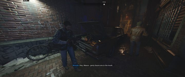 You begin your mission at a bar with Adler. After the conversation, go outside with Adler and take a gun from the car trunk (you can choose among 3 guns).