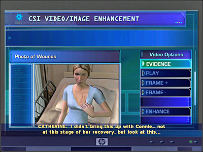 Use the lab computer. You will have to choose the fifth option from the main menu - Video/Image Enhance. Click on Evidence button. You will have to choose Photo of Wounds for further analysis. This is all going to happen automatically, so all you have to do is to listen to what Catherine has to say about the wounds. She will suggest a suicide attempt.