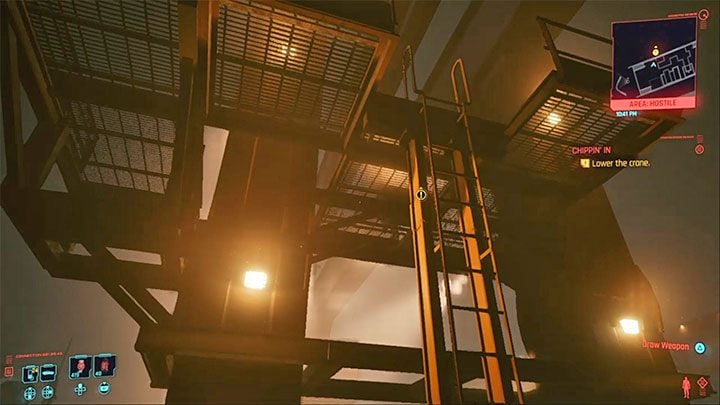 Go to the ladder shown in the picture to reach the metal balcony. Climb to the top and use the crane mechanism. It will lower down the container.