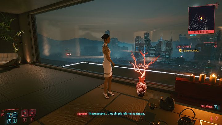 Hanako is held captive by Yorinobu in his North Oak estate and is under strict supervision of Arasaka agents. V has to get to the property and then free Hanako to get her help with the biochip.