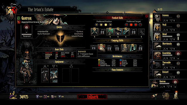 - Afflictions - negative status effects inflicted on heroes where their stress reaches the maximum level. They change the heroes' behaviour which hinders the fight and exploration. The mad heroes can be send for a rest in Town. There, the effects of insanity are being lowered down.