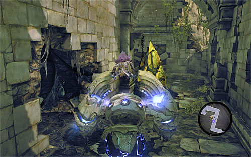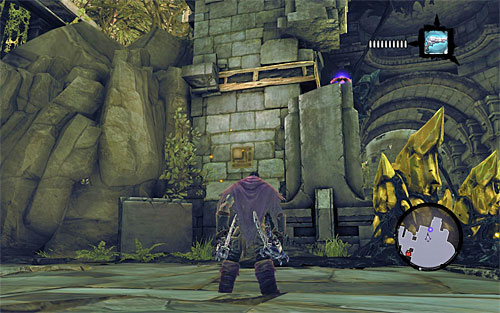 As for the aforementioned Tainted Construct Warriors, get to them only after eliminatingthe Sentinel, and you shouldn't have any problems with them. Once the battle is over, look around the whole area to find a Boatman Coin hidden in one of the bashable objects. Afterwards, approach the ledge shown on the screen (north wall) and grab onto the upper interactive edge. Move as far to the right as you can, go around the yellow objects blocking your way and drop down below.