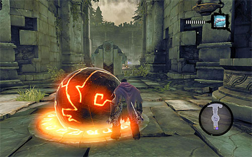 Once in the new area, use the pistol to destroy the dormant shadowbombs and "free" a new large ball. Roll it into a hole close by, which will raise the first of the two grates. Be cautious because as soon as you do it a large group of Tainted Constructs will appear.