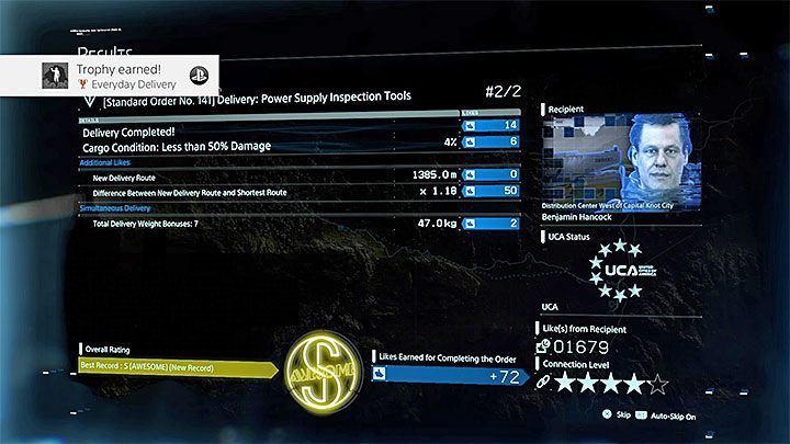 Commentary: A single order can require you to transport items weighing from 1-2 kg to about 100 kilograms. You can speed up the process of unlocking this trophy by taking on side missions with heavy cargo and then use a power exoskeleton or transport cargo in a truck.
