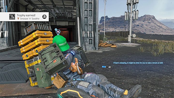 Commentary: You don't get this trophy by sleeping in any of the Private Rooms. Instead, have a short nap while traversing the game world. Select any area where there are no opponents. Deplete a portion of your stamina and then crouch to rest (Circle). Hold the Square - Sam will take a nap.
