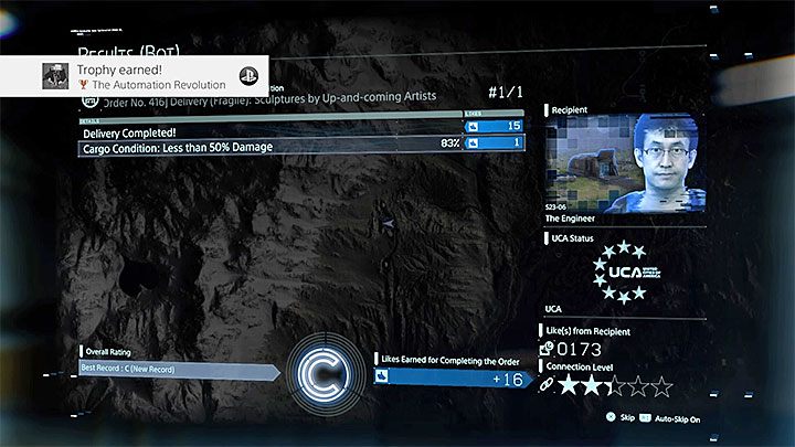 The game informs you about a completed bot order by showing you a message - return to any allied facility to register that order. Interact with the terminal and go to the orders menu. You get this trophy on the summary screen - you get it regardless of the bot's results (in our example, we got C rank).