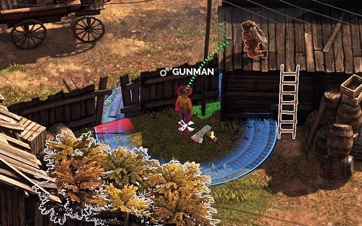 One of the interesting mechanics in Desperados 3 is the fact that when you're above your opponents you can avoid being detected and get closer to them more easily. This doesn't mean that while being over the enemy, the controlled character suddenly becomes invisible to the opponent. You can still be detected, but only if your character stands upright. Luckily, you just have to crouch to neutralize this potential threat.
