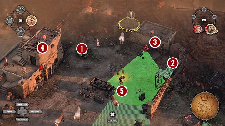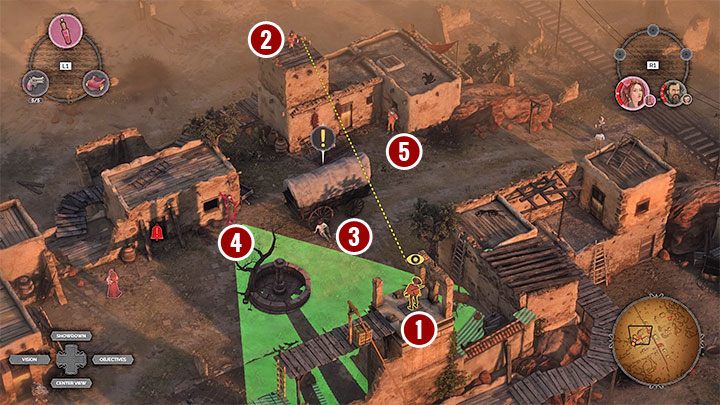- Distract or blind the enemies from Point 2 and use Hector to reach the tower (number 3). Before you kill him, blind the bandit from Point 4 with perfume.