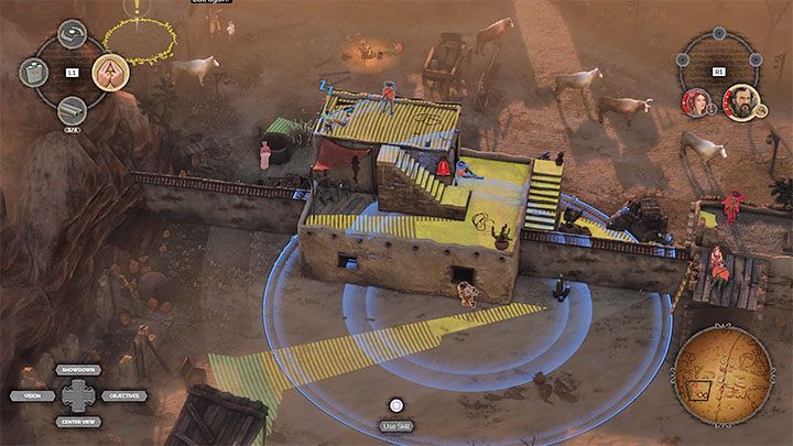Start by getting rid of as many enemies as possible stationed in the southern part of the village (M14,9). The standard enemies are the easiest, as they can be led to a secluded location by Kate. When it comes to other opponents, rely on whistling and flirting, both of which allow you to make poncho-wearing opponents look the other way. Try to get rid of most enemies from this area. Those standing on roofs and towers should be checked whether they are in the viewcones of more distant opponents.