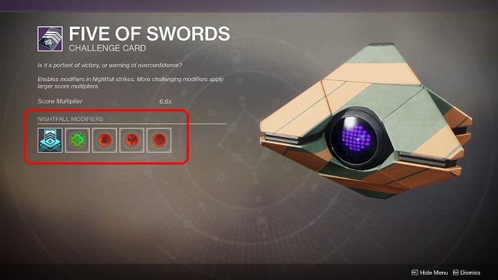 Five of Swords (Challenge Card) is a special item which you can use to additionally modify Nightfall: The Ordeal missions. Challenge Cards have the ability to make the mission more difficult, but also increase the Score Multiplier so that you can score more points and thus make it easier for you to score above 100,000 points to complete the Weekly Challenge. If you haven't got your Five of Swords card yet then you can find out how to get it in the FAQ section of this guide.