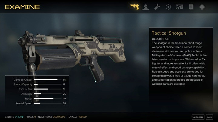 Tactical shotgun is often used by military forces, which makes it very common find in the game world (along with access to ammunition). It's the best choice for close-range combat. The weapon statistics can be greatly increased, a number of modifications is also available, with the Burst Fire mod deserving special attention. Devastator shotgun, described below, share certain similarities with Tactical shotgun, but imposes certain restrictions on the player.