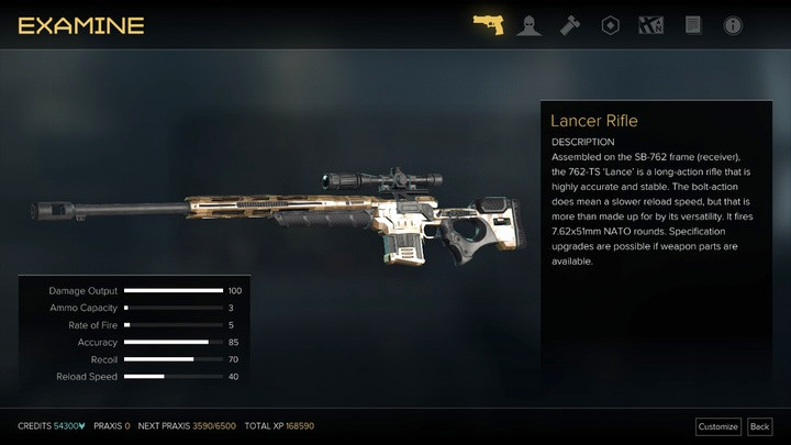 Each weapon can be upgraded. There are slots for specific expansions (suppressors, sights) for specific weapon types. Once added expansion cannot be dismantled (it can be removed, but not used for a different weapon). Upgrades can be bought in shop or found in the game world. At any time of the game you can pause and quickly customize your weapon in the minimenu. When it is opened you can change the weapon mode (it must be unlocked with parts), put on or remove the suppressor or change ammunition type (it is also possible after holding reload button for longer). Weapons can be also upgraded with parts that slightly increase the parameters: rate of fire, strength or capacity.