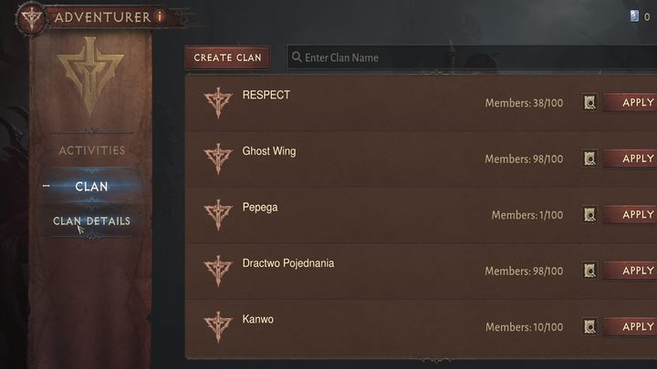 Each player receives the ability to join a clan after completing the Forgotten Tower dungeon in Darkwood (which is a mandatory story quest). Once the dungeon is cleared, a new tab (Adventurer) will become available in the game menu. After selecting it, you get access to the list of and the clan search engine - each can have up to 100 members. You can apply to several clans at the same time even if you await one of the founders' decision to accept you into his ranks.