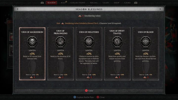 - Smoldering Ashes can be spent on new levels of Seasonal Blessings. These are special, permanent bonuses that only work during their respective season.