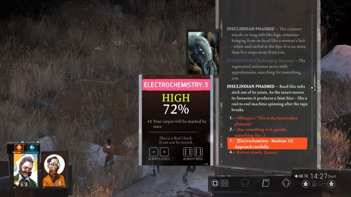 Passing the check will allow you to ask the phasmid a few questions. Regardless of the course of the meeting, the phasmid will eventually leave the location.