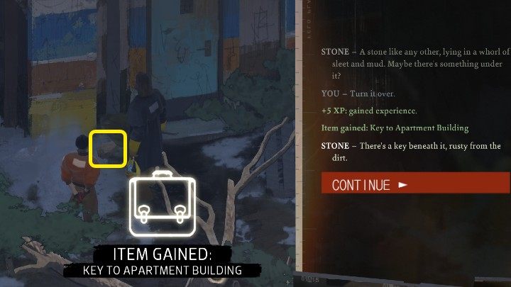 Before you part ways, smoker will point his finger to a stone before the building door. Look under it to find Key to Apartment Building.