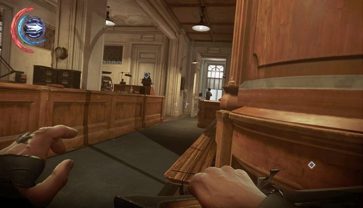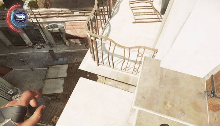 After climbing up, you should find yourself in the spot shown above. The path going left will lead you straight to the station; the path right - to the outpost. Use blink or a far jump to get onto the first floor and walk around the corner on the balcony. There's a guard patrolling the balcony on the other side - crouch and eliminate him.