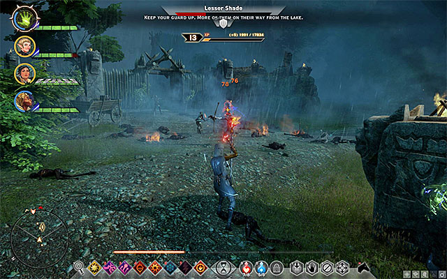 You now need to return towards the gate, where you started your exploration of Crestwood. Note that thanks to lowering the water level in the lake, you can now access the Old Crestwood, located to the West of the Northern campsite. Enter the destroyed village and watch out, because there are many monsters around. You need to find the passage to the Flooded Caves shown in the above screenshot (M13,1f).