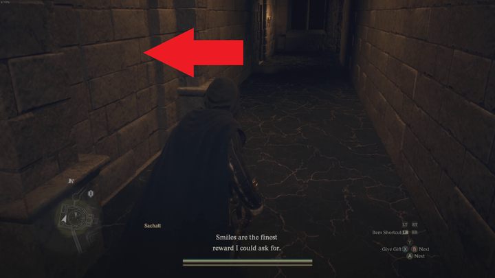 Upon arriving to the hall, you'll watch a short cut-scene featuring false Arisen walking down the corridor. You can immediately follow him or snoop around the area a bit, listening to the conversations of the Vernworth elite. To continue with the quest, go to the corridor behind the round hall. On one of the walls between doors you'll notice a suspiciously-looking fragment of the surface. Push the element to reveal a camouflaged secret passage.