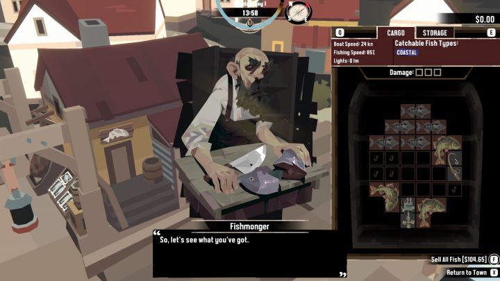 When you exhaust the dialogue options, the trading window will appear. Sell all fish by holding down the F key (PC), the square (PS) or the X button (Xbox).