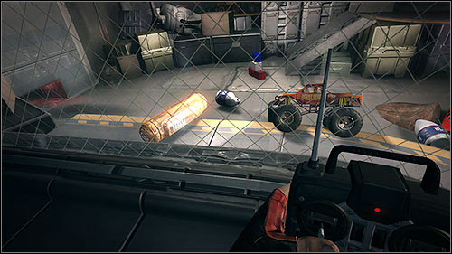 Do it and the door leading to the third cell will open. It turns out to be inside a locker room, behind glass. Luckily you have a remote control car at your disposal. Use it to pull the cell to the hole by the door.