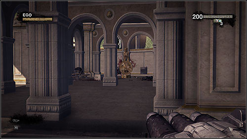 After going a bit further down the street you will reach a machine gun nest which you can use to grind hordes of Pigs and assault troopers. However make sure no one approaches you from behind. Move on following the left lane to avoid the fire of the machine gun on the right. Nearby the barricade (in the form of a downed vehicle) which you will reach you will find a small "armoury" below the destroyed bridge, which you can use while you're at it.