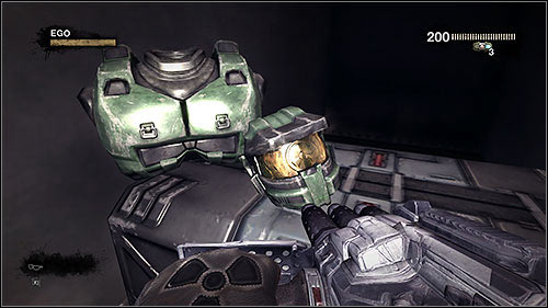 Right after the beginning of the level approach the EDF vehicle where you can change your weapon and restock on ammo. Inside the vehicle there's an armour, very similar to Master Chief's in Halo - approach it and look at the helmet. It's the first of three famous helmets that you need to find in the game to unlock Bucket Head.