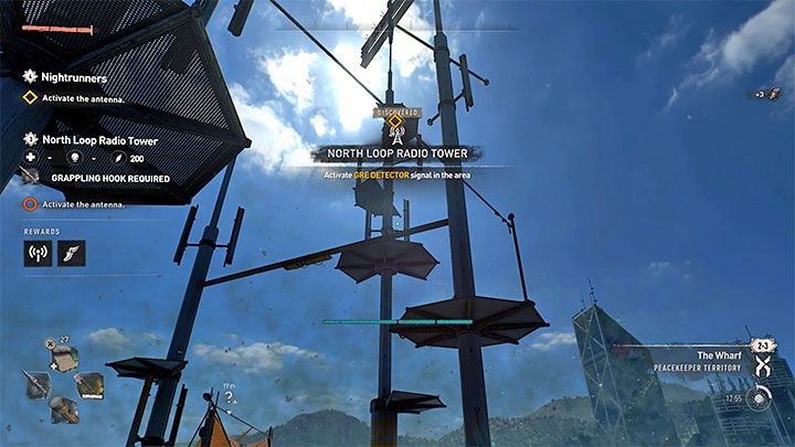 Your destination is in The Wharf district. It's a radio tower antenna on a skyscraper's roof. Unfortunately for you, this means a long climb. You can't use the paraglider to land on the rooftop, as the antenna is on the tallest building in the area.