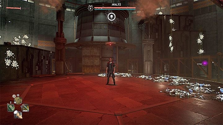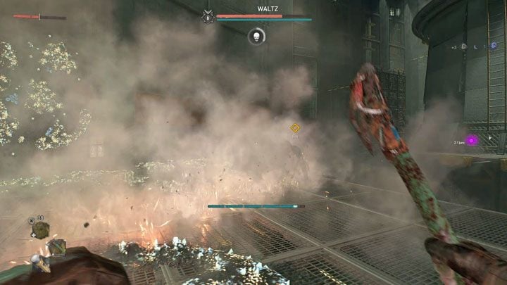 This phase of the fight puts your parkour skills to the test. You must rely on the environment ( bars, yellow ledges) to reach the platforms Waltz awaits at. Prioritize precise jumps and gripping onto objects.