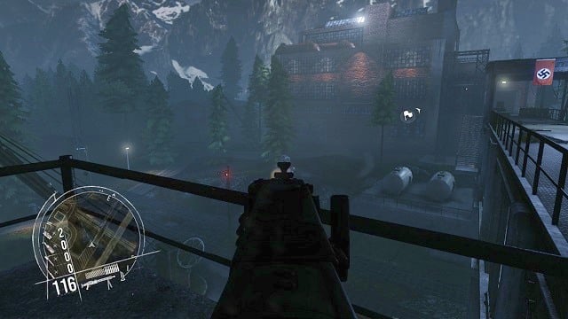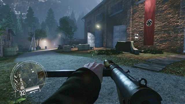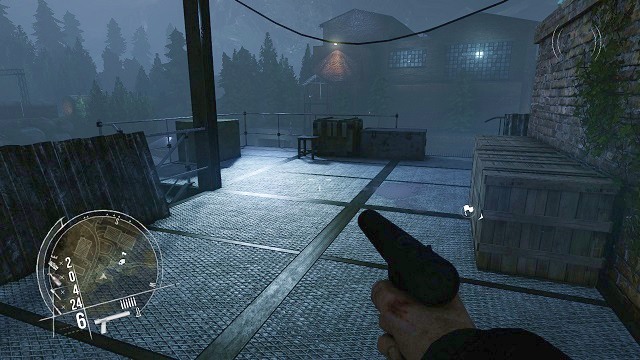 After the three watchmen are already dead, enter the facility grounds, and immediately head towards the first building in the area (the one with the flags with a swastika on it).