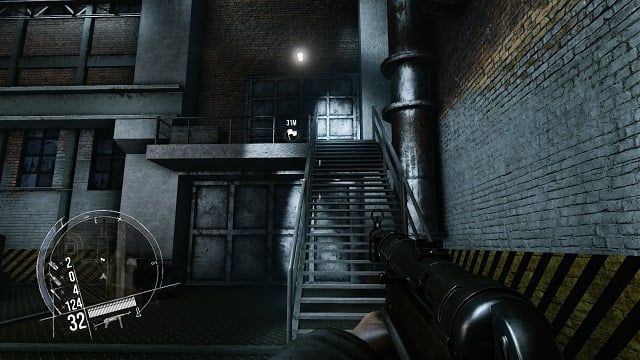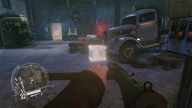 Afterwards, approach a blocked truck, which can be released by shooting and destroying the box standing in front of the vehicle. After doing that, the truck will automatically drive out of the building, hitting the wall of a nearby building in the process. This happening will attract the attention of a few guards located outside, diverting them from you. After that run as quickly as possible to the second floor of the building, and approach the stairs with a metal railing, which leads to the facility.