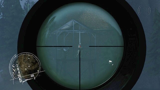 Take up a convenient firing position and look for all the targets in the area by using your rifle scope. There are several enemy soldiers patrolling the encampment, as well as two watchmen on top of watchtowers. You should only make your shots when a volume icon appears in the upper right corner of the screens (the noises are made by a truck).