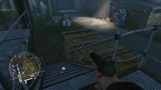 After emerging outside, you will see a vast number of buildings all around your current position. Approach carefully to the edge of the railing and pick the sniper rifle, leaning on one of the boxes. At the very same moment you pick up the weapon, a short cutscene should start, during which Hawkins, by using binoculars, notices Dietrich entering the further part of the enemy factory.